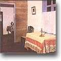 "С этим столом, как рассказывал отец, - писала она, - было у него связано много воспоминаний о поэте. За ним он читал отцу свои произведения. Накануне последнего отъезда Лермонтова из Петербурга они вместе разбирали бумаги, старые рукописи поэта, хранившиеся в ящиках его стола, отбирая нужные стихотворения для нового сборника, ненужные рукописи сжигали в камине". За этим столом были написаны в Петербурге "Герой нашего времени", "Демон", "Мцыри", "Бородино", "Смерть поэта", "Дума" и многие другие его поэтические создания. В другой комнате, служившей столовой и гостиной, у небольшого деревянного диванчика, покрытого войлочным ковриком, стоит круглый столик. Это подлинная вещь, сохранившаяся из прежней обстановки домика. По утрам Лермонтов работал за ним, вынося его на терраску, пристроенную со стороны сада.